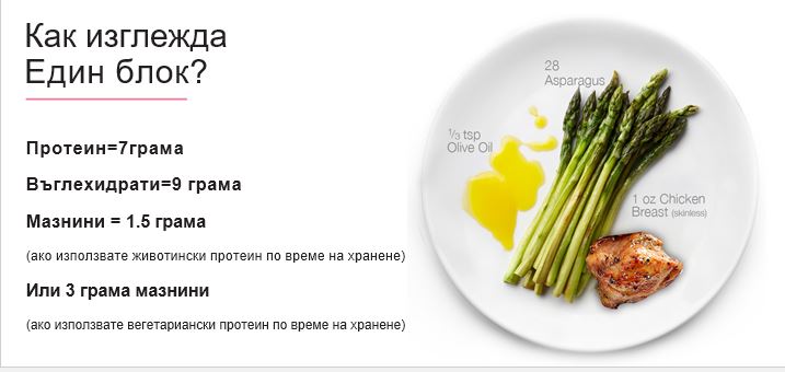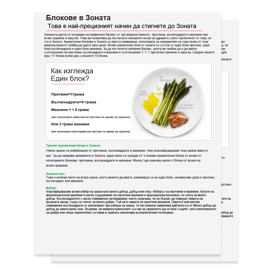 Диета Зоната се основава на правилния баланс на три макронутриента – протеини, въглехидрати и мазнини – при всяко хранене и лека закуска. Това ви позволява да постигнете желаните ползи за здравето, които произтичат от спазването на диета Зона. Зоновите хранителни блокове са просто мярка, използвана за определяне на това колко от тези макронутриенти трябва да приемате през деня. Всеки Зонов хранителен блок се състои от един блок протеини, един блок въглехидрати и един блок мазнини. За да постигнете желания баланс, целта ви трябва да бъде съотношение 1:1:1 на блокове протеини, въглехидрати и мазнини при всяко хранене и лека закуска. Средностатистическата жена изяжда по 11 блока на ден, а средностатистическият мъж – по 14 блока на ден.