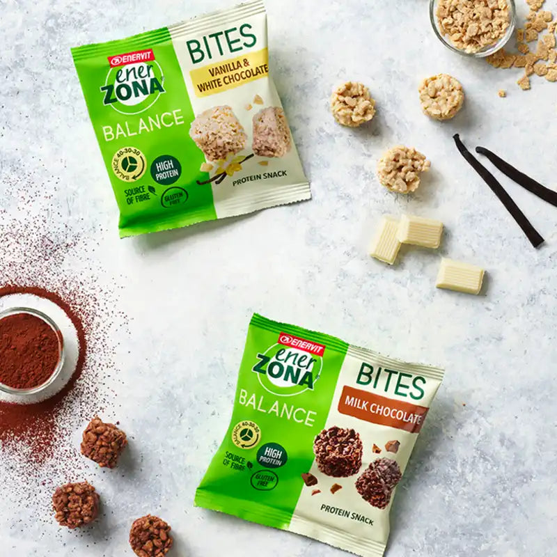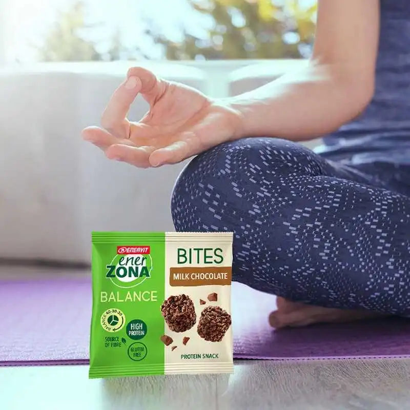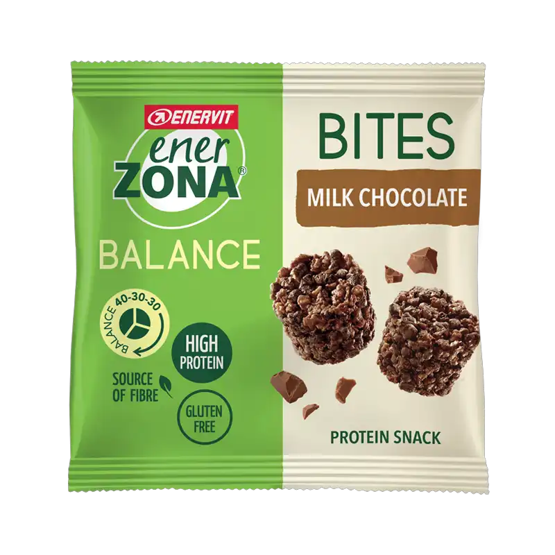 EnerZona Хапки Млечен Шоколад е безглутенова закуска, направена от соя и млечен шоколад, богата на протеини и фибри. Всяка хапка е балансирана 40-30-30, за да предложи правилния баланс на въглехидрати, протеини и мазнини, нужни за да сте в Зоната, заедно с удоволствието от неповторимия вкус (1 минипакет = 1 блок).