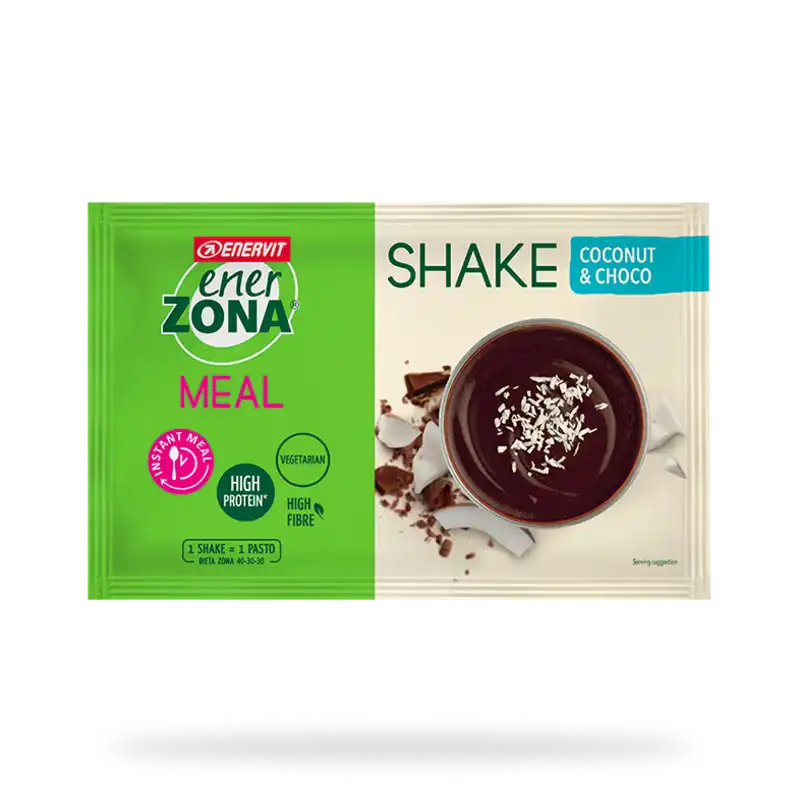 Енерзона Шейк Кокос & Шоколад е приятен и деликатен шейк, на основата на грахов протеин, какао и фруктоза, с добавени изсушени парченца кокос. Не съдържа багрила и консерванти. Съдържанието на 1 плик, разтворен в 150 мл вода, осигурява съотношение на въглехидрати, протеини и мазнини, равно на 40-30-30, изразено в калории.