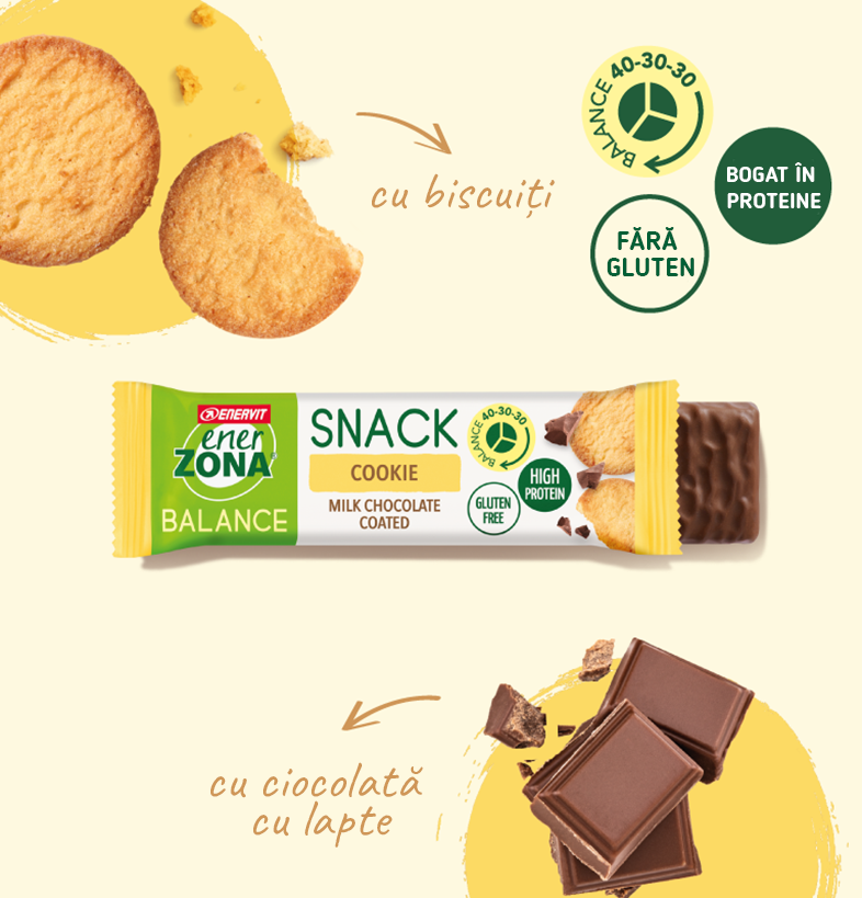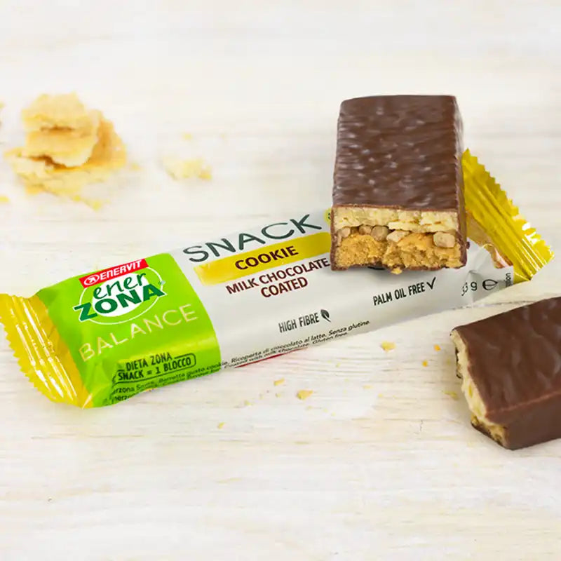 EnerZona Snack Cookie е прегръдка от млечен шоколад с ароматни трохи от бисквитки. Това е класическа бисквитка във вкусен бар, който се намира в Zone.
